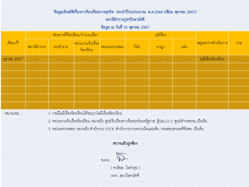 ข้อมูลเชิงสถิติเรื่องการร้องเรียนการทุจริต เดือน ตุลาคม 2567