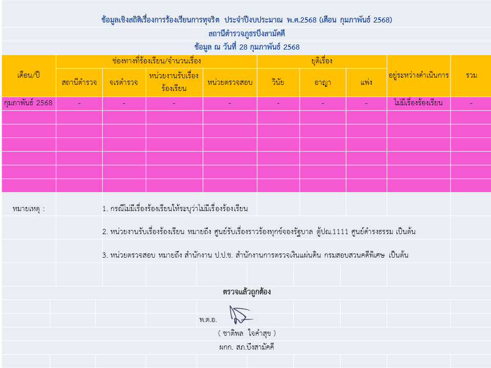 ข้อมูลเชิงสถิติเรื่องการร้องเรียนการทุจริต เดือน กุมภาพันธ์ 2568
