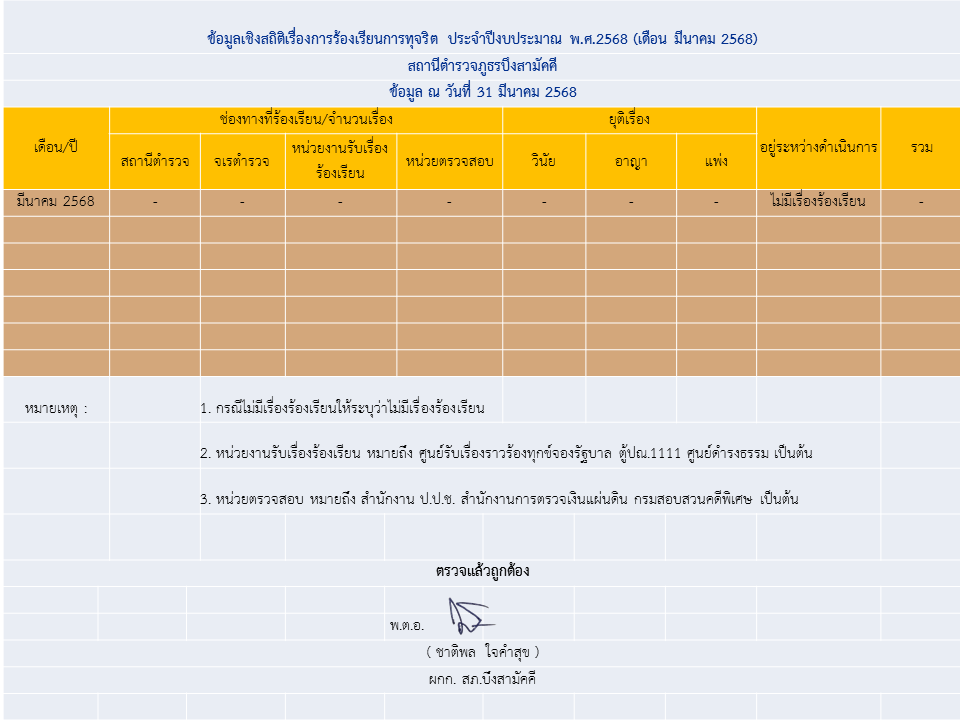 ข้อมูลเชิงสถิติเรื่องการร้องเรียนการทุจริต เดือน มีนาคม 2568