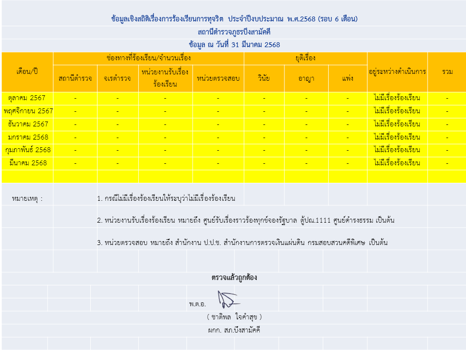 ข้อมูลเชิงสถิติเรื่องการร้องเรียนการทุจริต รอบ 6 เดือน